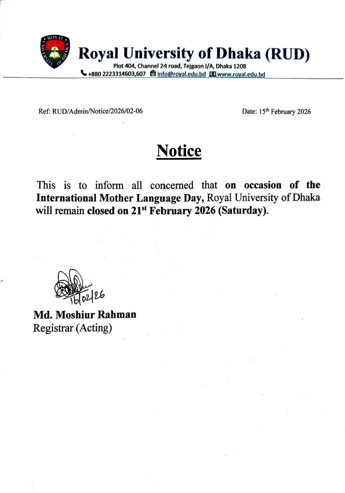 21st February Holiday Notice