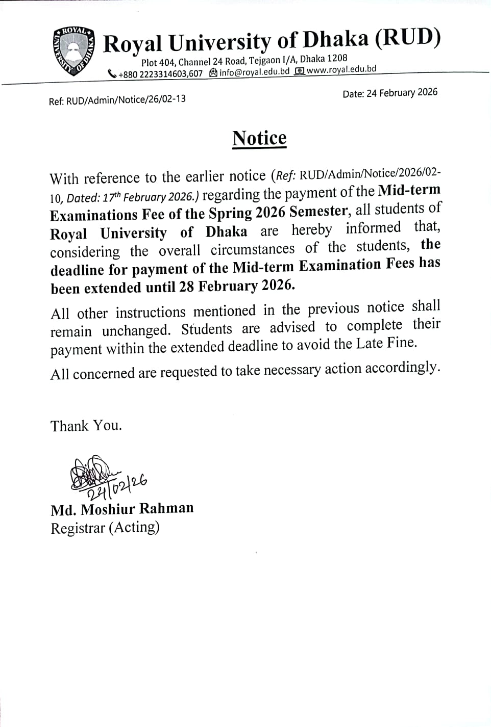 Extended Date for Mid-term Fees, Spring-2026