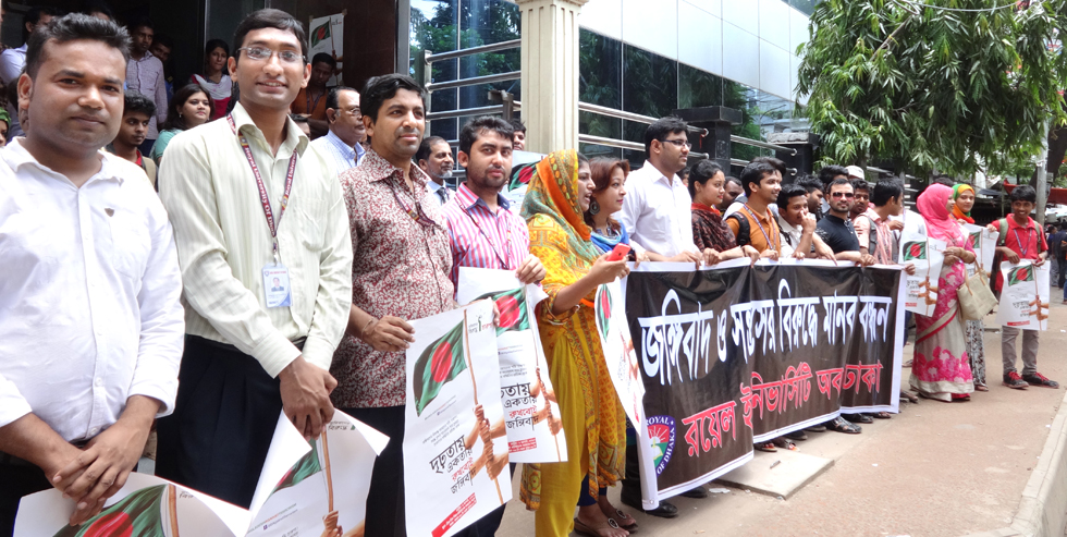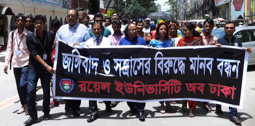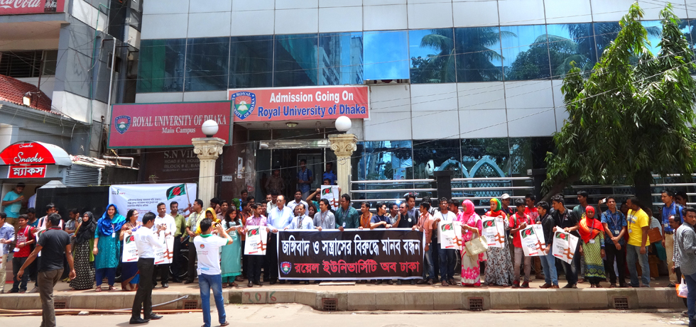A Human Chain and Rally program protesting the Militancy and Terrorism was held at and around RUD on 01 August 2016 from 11:00 am to 12:00 pm. Colonel (Retd) Professor Md. Mosharrof Hossain, Vice Chancellor (Acting), Professor Manik Kanti Majumder, Acting Dean, Faculty of Business Administration, Professor Anisur Rahman, Head, Department of Business Administration, Faculty members, officers and students of RUD participated in the program. RUD expressed its indomitable vow to help stop all sorts of Militancy and Terrorism from the country.