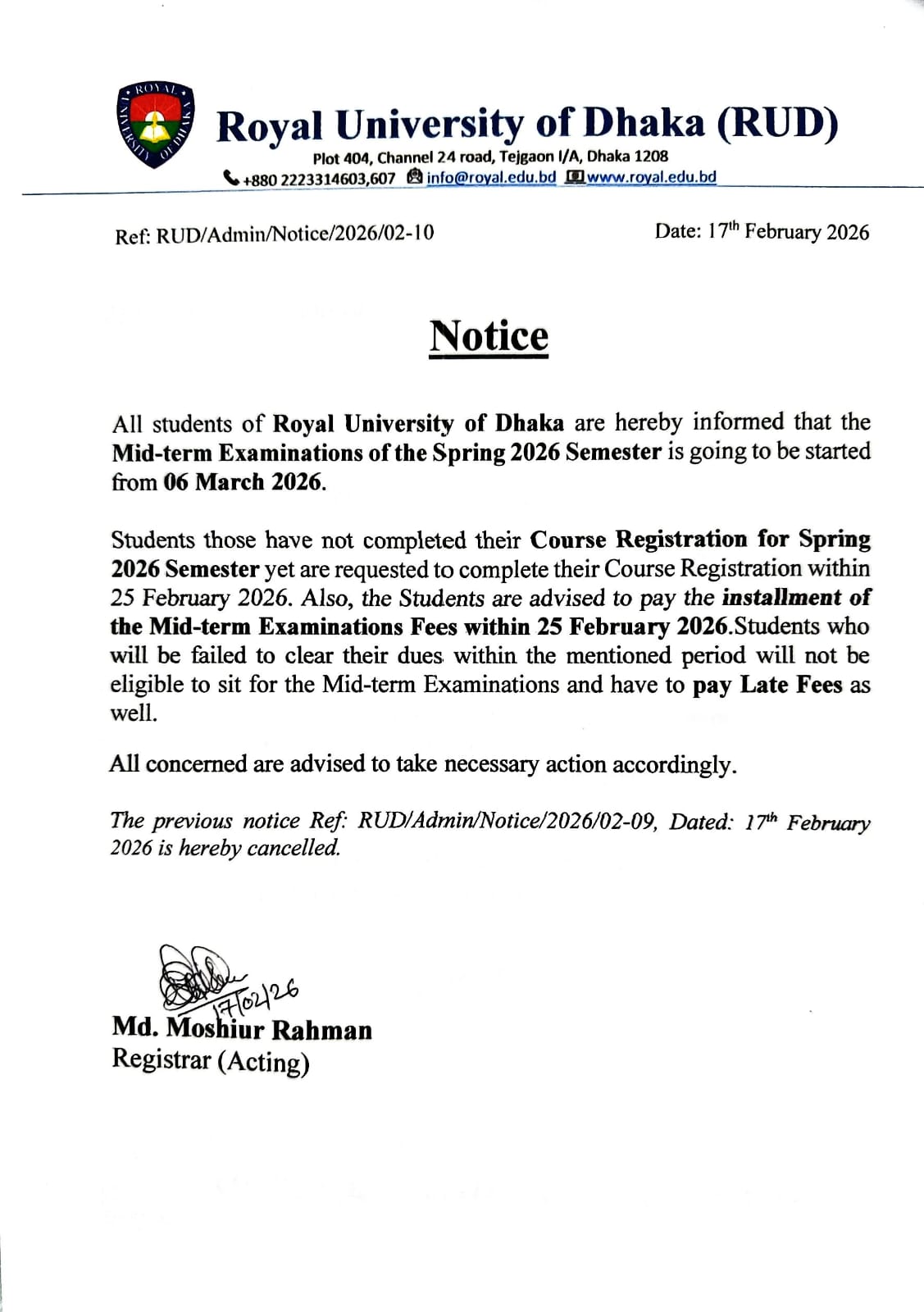 Notice on Mid-term & Registration Fees Spring-2026