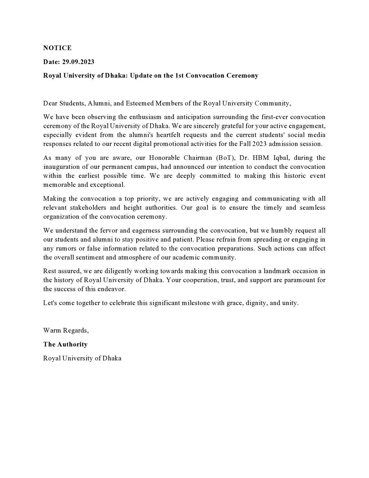 Notice regarding the 1st ever convocation of RUD