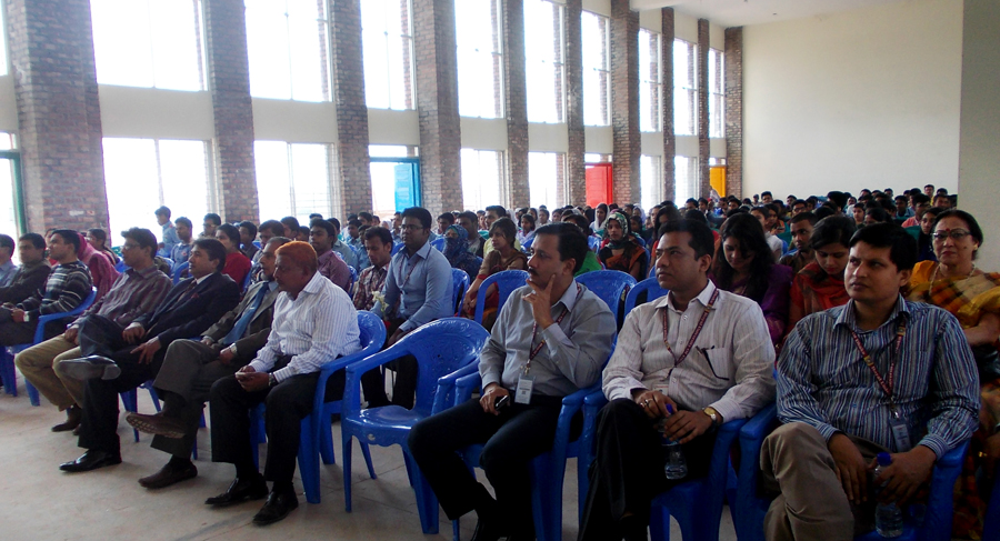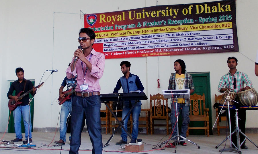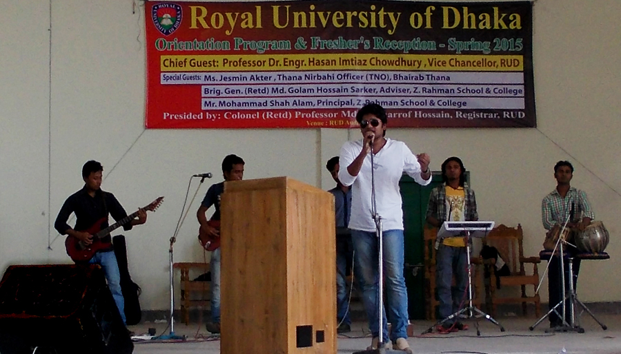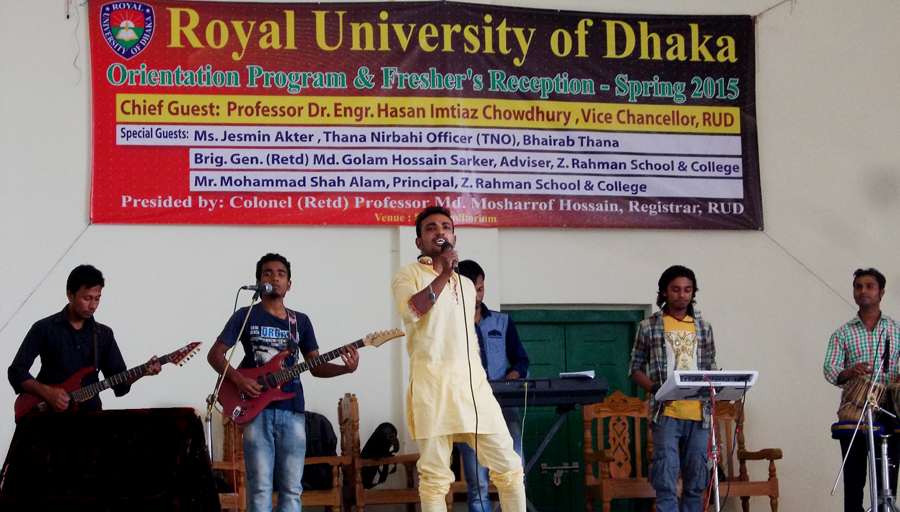The Orientation Program and Fresher’s Reception of the newly admitted students for Spring Semester 2015 in different academic programs of Royal University of Dhaka (RUD) Permanent Campus were held at the RUD Auditorium at Bashgari, Bhairab on 07 March 2015. The objective of the program was to welcome the new students and orient them to the university facilities, faculty members, administrative staffs and academic system. Prof. Dr. Engr. Hasan Imtiaz Chowdhury, the Vice Chancellor of RUD graced the occasion as Chief Guest. In his inspiring speech he urged the newly admitted students to make the best use of the University resources. Brig Gen (Retd) Md. Golam Hossain Sarker, Advisor, Z. Rahman Premier Bank School & College and Mr. Mohammad Shah Alam, Principal, Z. Rahman Premier Bank School & College attended the program as Special Guest. Colonel (Retd) Prof. Md. Mosharrof Hossain, Registrar presided over the program and thanked the Chief Guest, Special Guests and assured the students a comfortable and useful stay at RUD. Among others, Prof. Manik Kanti Mazumder, Dean (Acting), Heads of the Departments and Sections were also present in the program and spoke on various aspects and facilities of the university. At the end of the program a Cultural show was presented by the students of RUD.