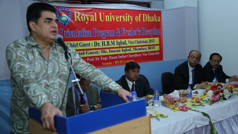 The Orientation Program and Fresher’s Reception of the newly admitted students for Spring Semester 2015 in different academic programs of Royal University of Dhaka (RUD) were held at the RUD Students’ Lounge on 14 February 2015. The objective of the program was to welcome the new students and orient them to the university facilities, faculty members, administrative staffs and academic system. Dr. H B M Iqbal, Hon’ble Vice Chairman, BOT, RUD graced the occasion as Chief Guest. He expressed his dream, expectation and future plan of the university. His inspirational and motivational speech encouraged the students. Mr. Kazi Abdul Mazid, CEO, Premier Group and Mr. Ehsan Khashru, Advisor, Premier Bank Ltd. attended the program as Special Guest. Colonel (Retd) Prof. Md. Mosharrof Hossain, Registrar welcomed the students to the campus and assured them a comfortable and useful stay at RUD. Among others, Prof. Manik Kanti Mazumder, Dean (Acting), Associate Dean, Heads of the Departments and Sections were also present in the program and spoke on various aspects and facilities of the university.