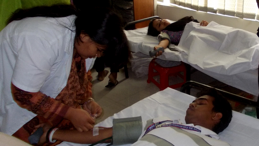 Royal University of Dhaka organized a day long voluntary Blood Donation program under arrangement of Quantum Foundation at the university library on 15 June 2015. A total of 23 bags of blood were contributed by the students and officers of the university. The Vice Chancellor (Acting) Colonel (Retd) Prof. Md. Mosharrof Hossain in his inspiring approach highly appreciated the blood donors for responding to such a noble cause of humanity.