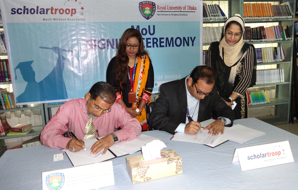 The signing ceremony of Memorandum of Understanding (MoU) between Royal University of Dhaka and Scholartroop was held on 26 July 2016 at the RUD Library.