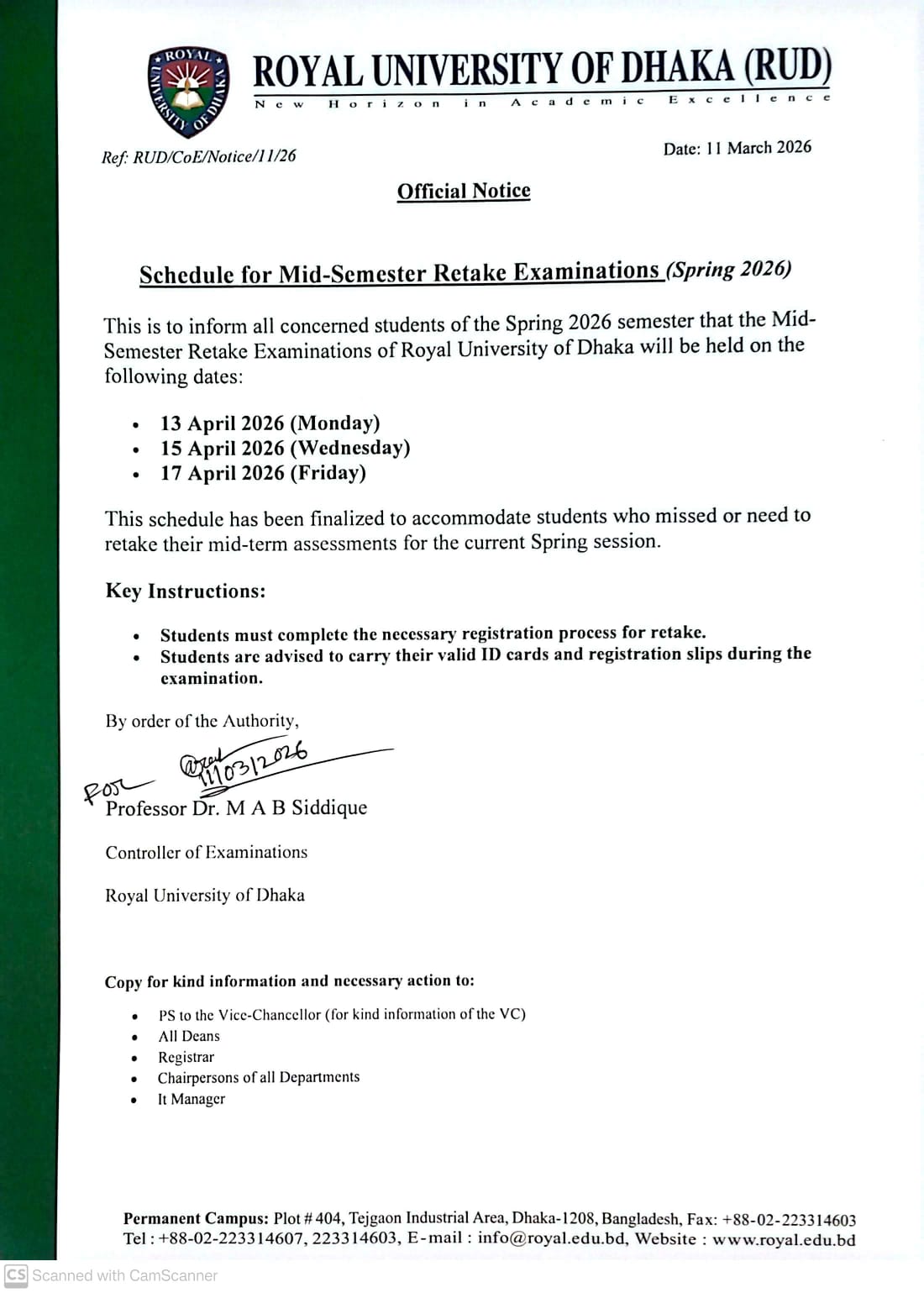 Schedule of Mid Semister Retake Exam Spring 2026